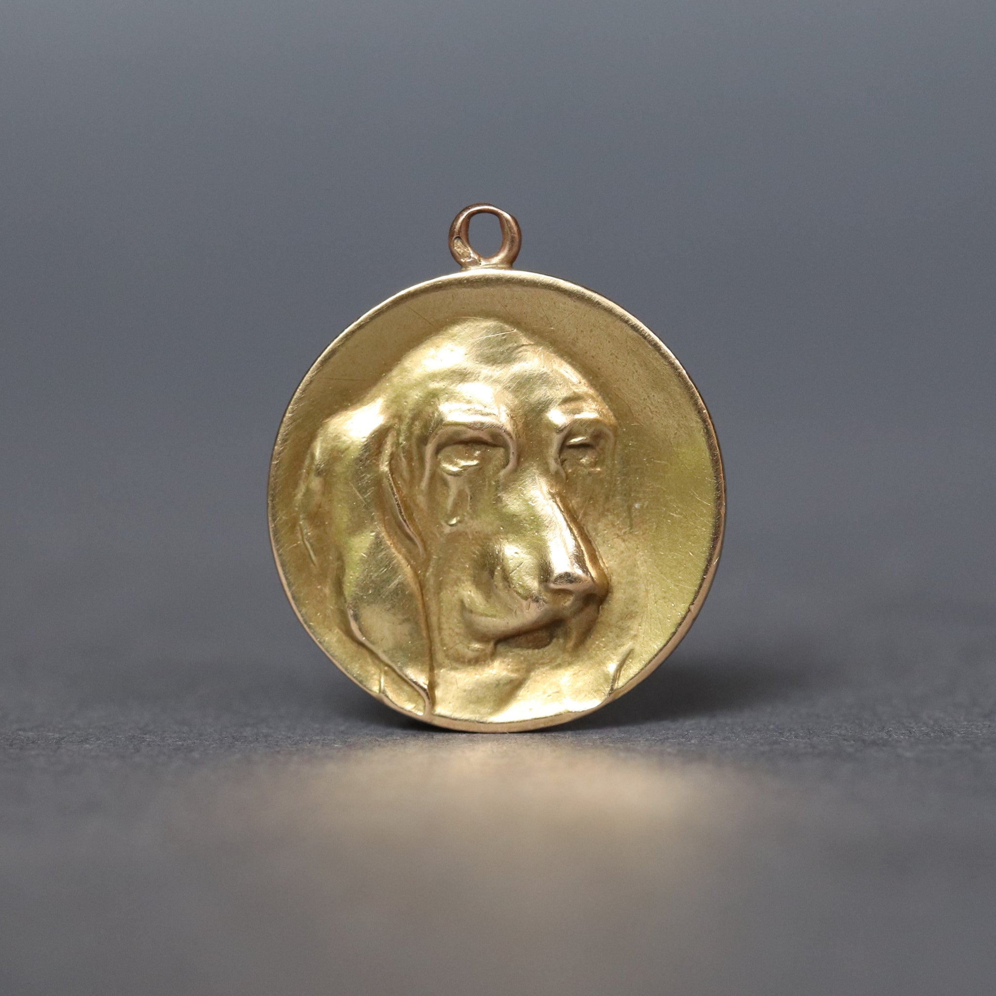 An exquisitely crafted antique French pendant dating to the Art Nouveau era (1895-1910). The circular pendant depicts a basset hound in relief, with soft lines and naturalistic style characteristic of the Art Nouveau movement. Crafted in buttery yellow 18ct gold, this beautifully executed piece is a timeless classic.