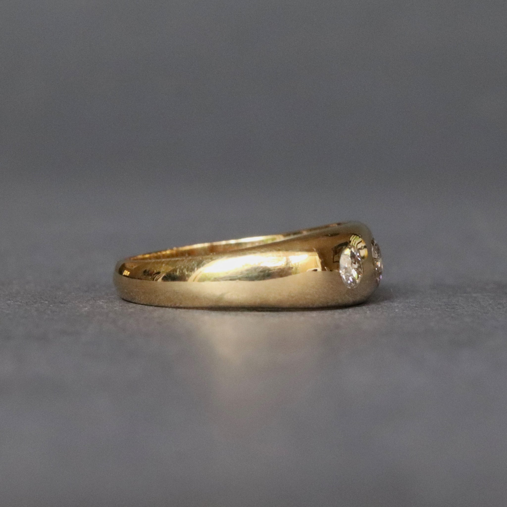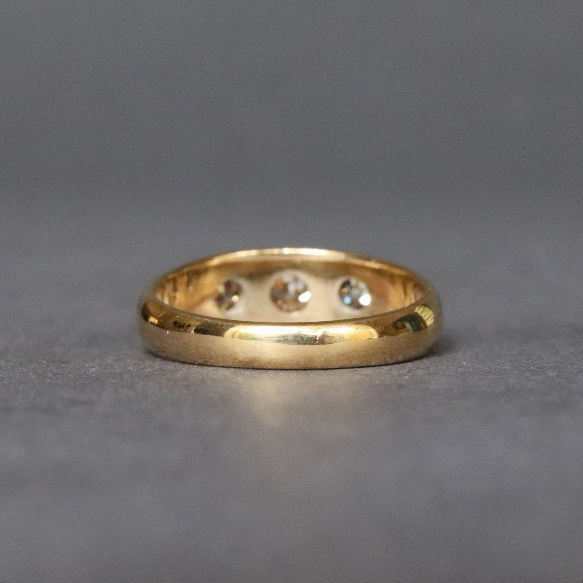 A wonderful antique three stone diamond gypsy ring. Three sparkling old cut diamonds, totaling approximately 0.4ct weight, are set in an 18ct yellow gold band with a D-shaped profile. The ring is simple and elegant - a fine example of its style - and dates to the early 20th century.