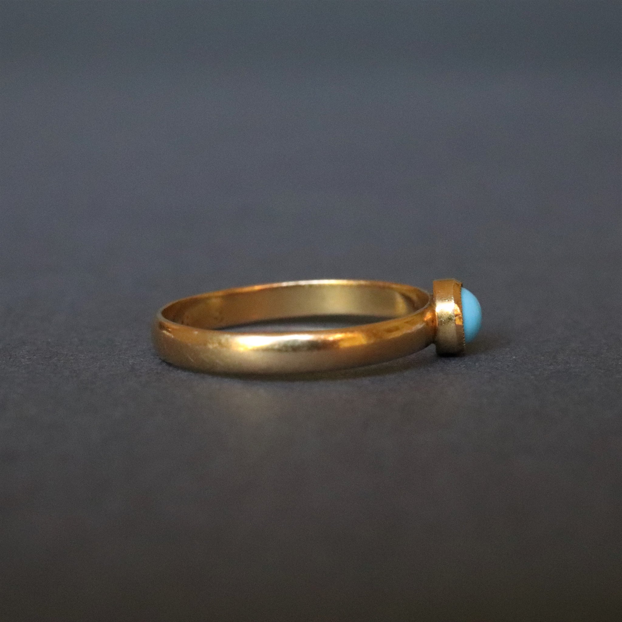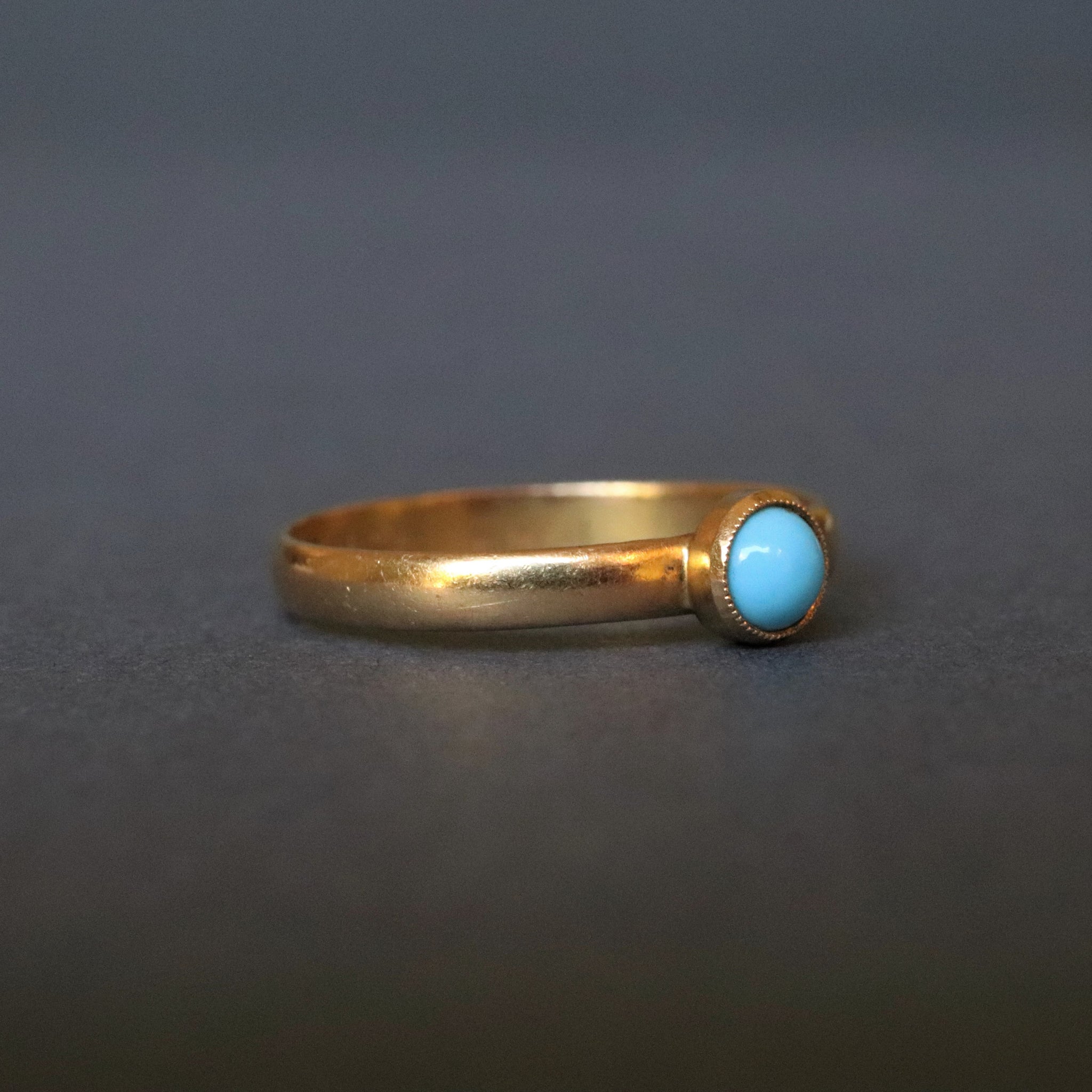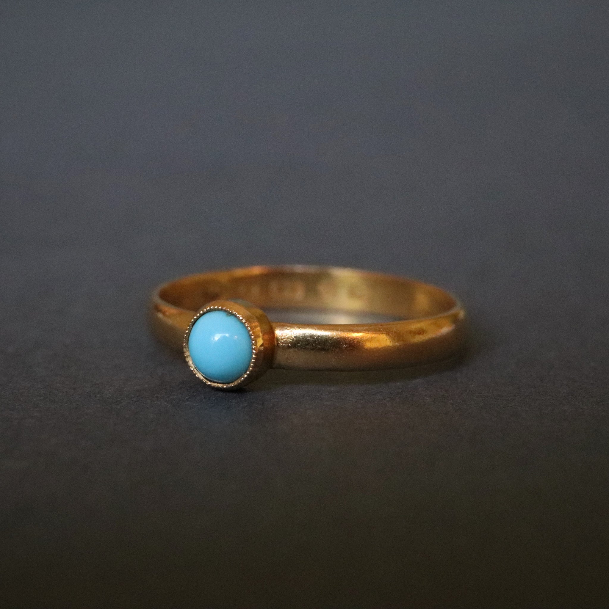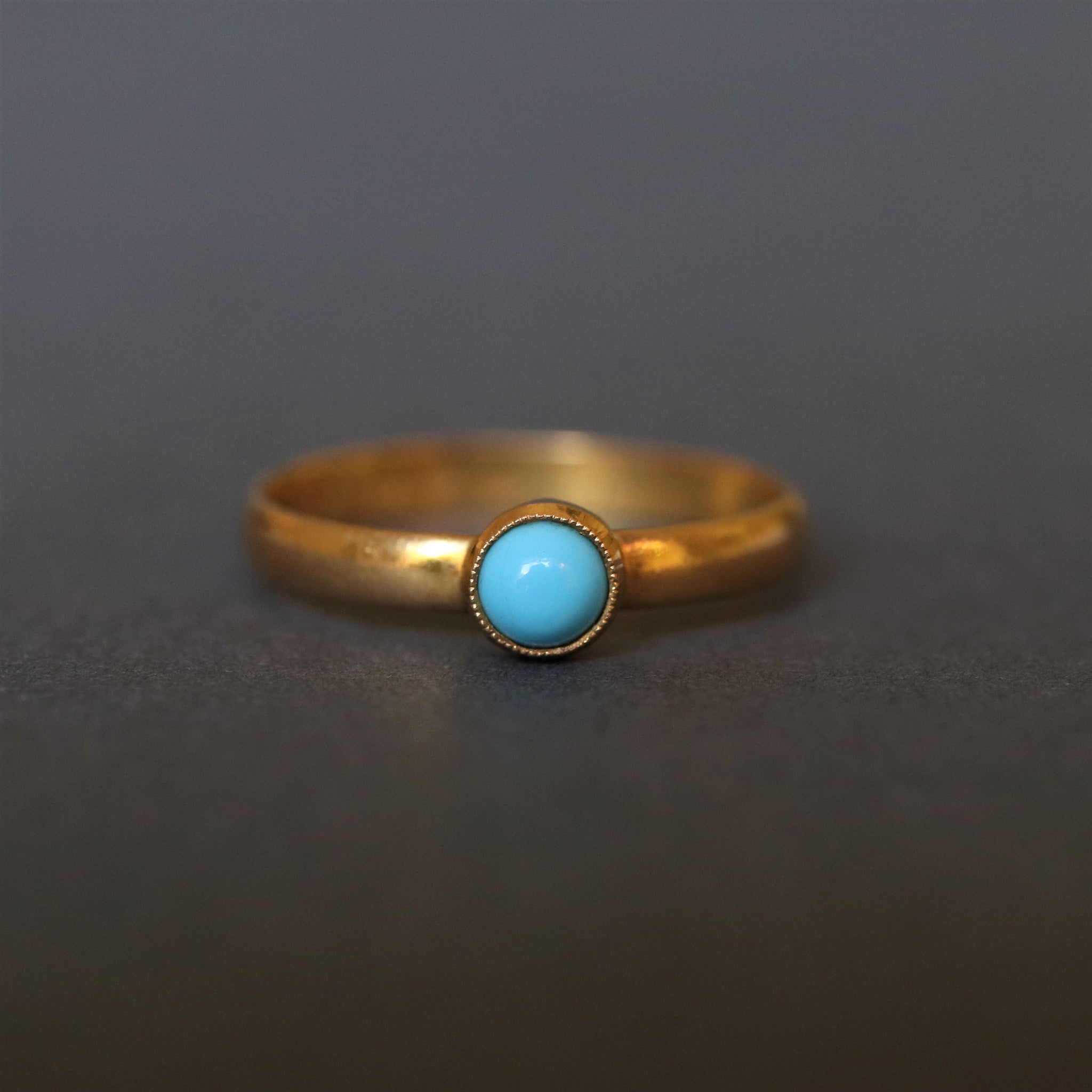 A beautiful and stunningly simple antique Victorian era (1837-1901) solitaire ring. The ring features a cabochon cut turquoise in a millegrain setting on a buttery yellow 22ct gold band. Though is minimal in design, this ring has lots of visual impact. It's perfect for stacking or for wearing on its own.