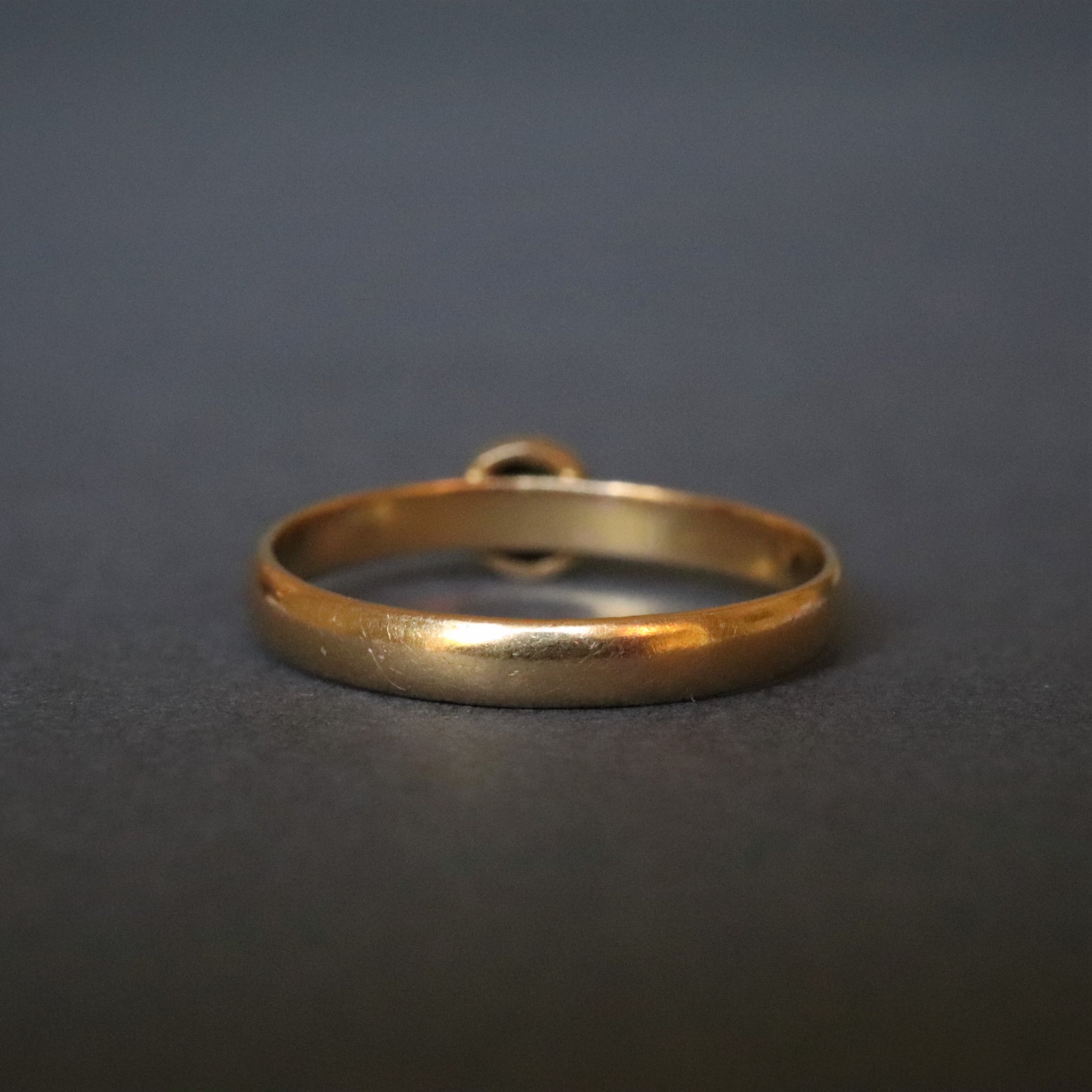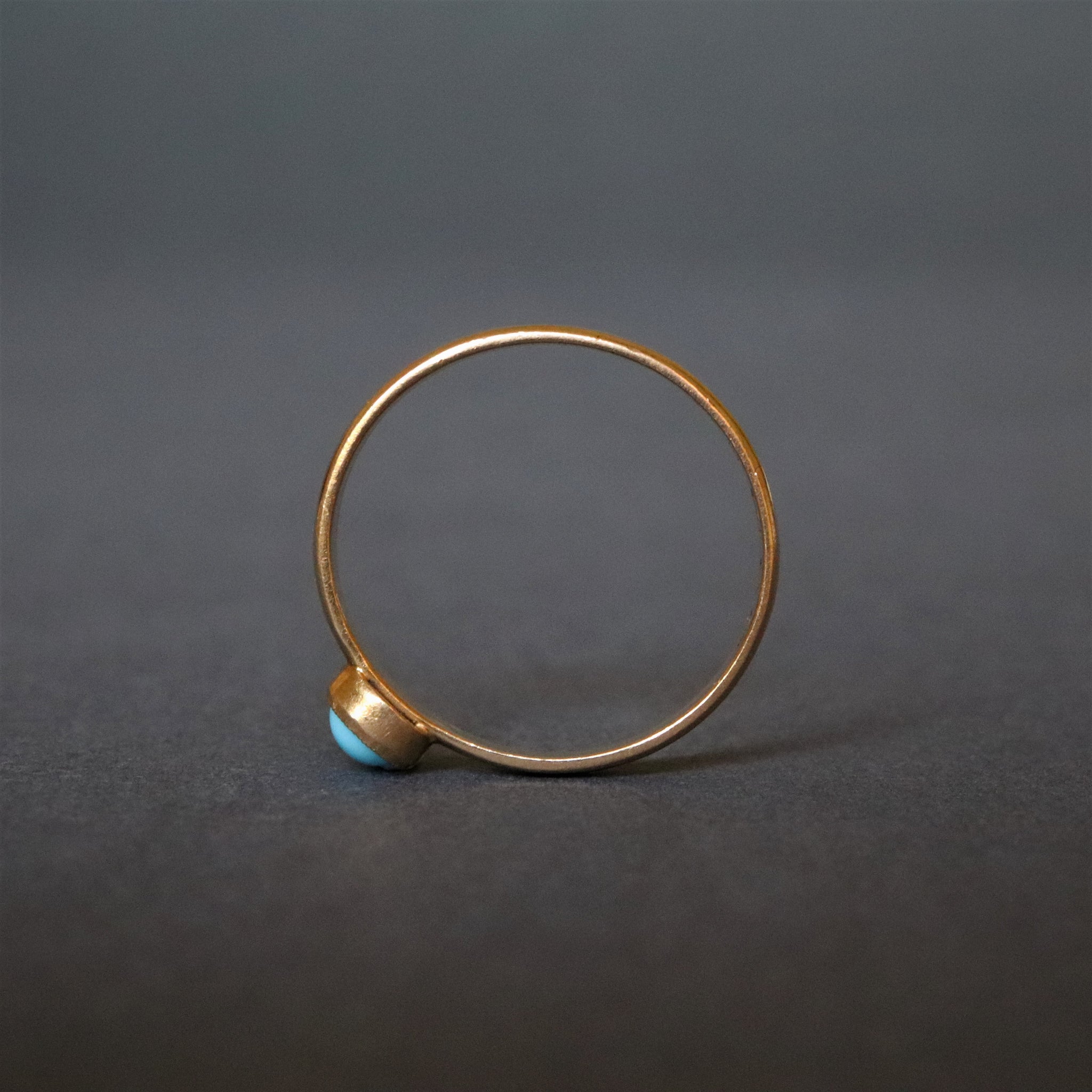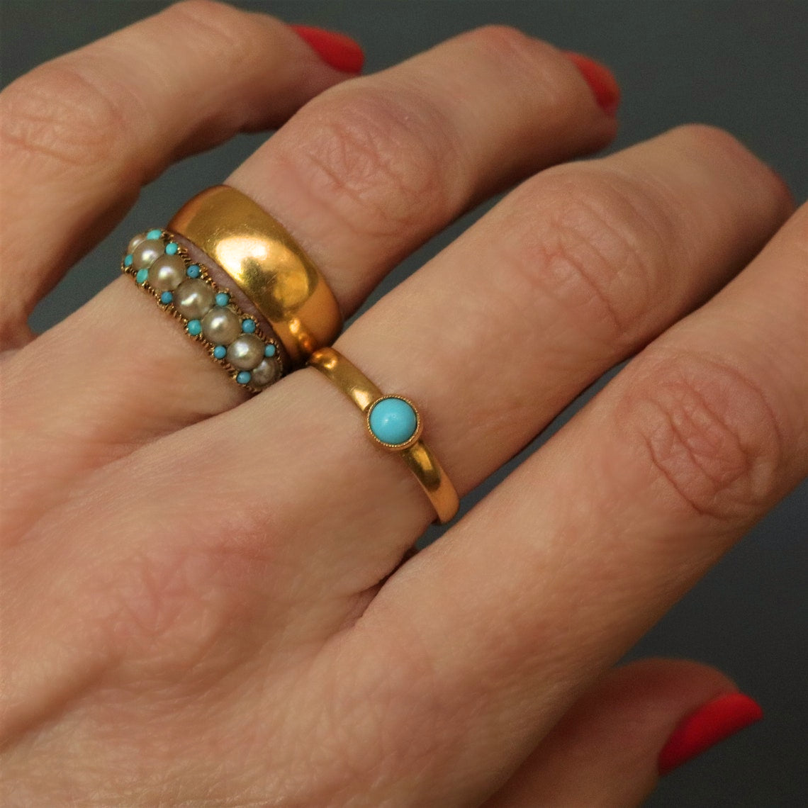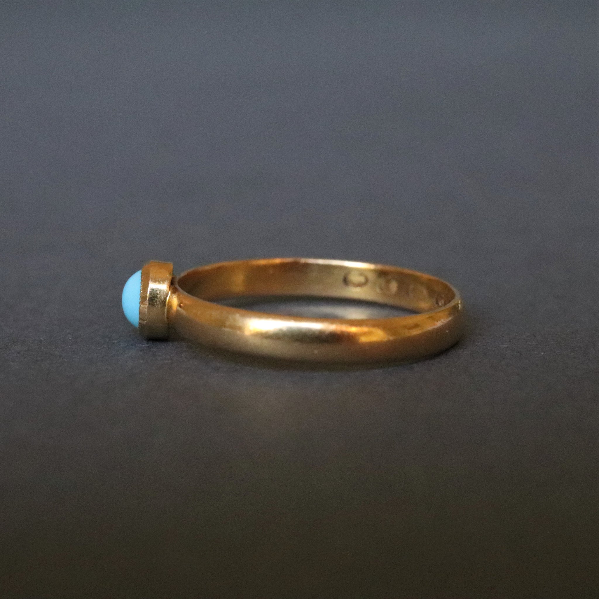A beautiful and stunningly simple antique Victorian era (1837-1901) solitaire ring. The ring features a cabochon cut turquoise in a millegrain setting on a buttery yellow 22ct gold band. Though is minimal in design, this ring has lots of visual impact. It's perfect for stacking or for wearing on its own.