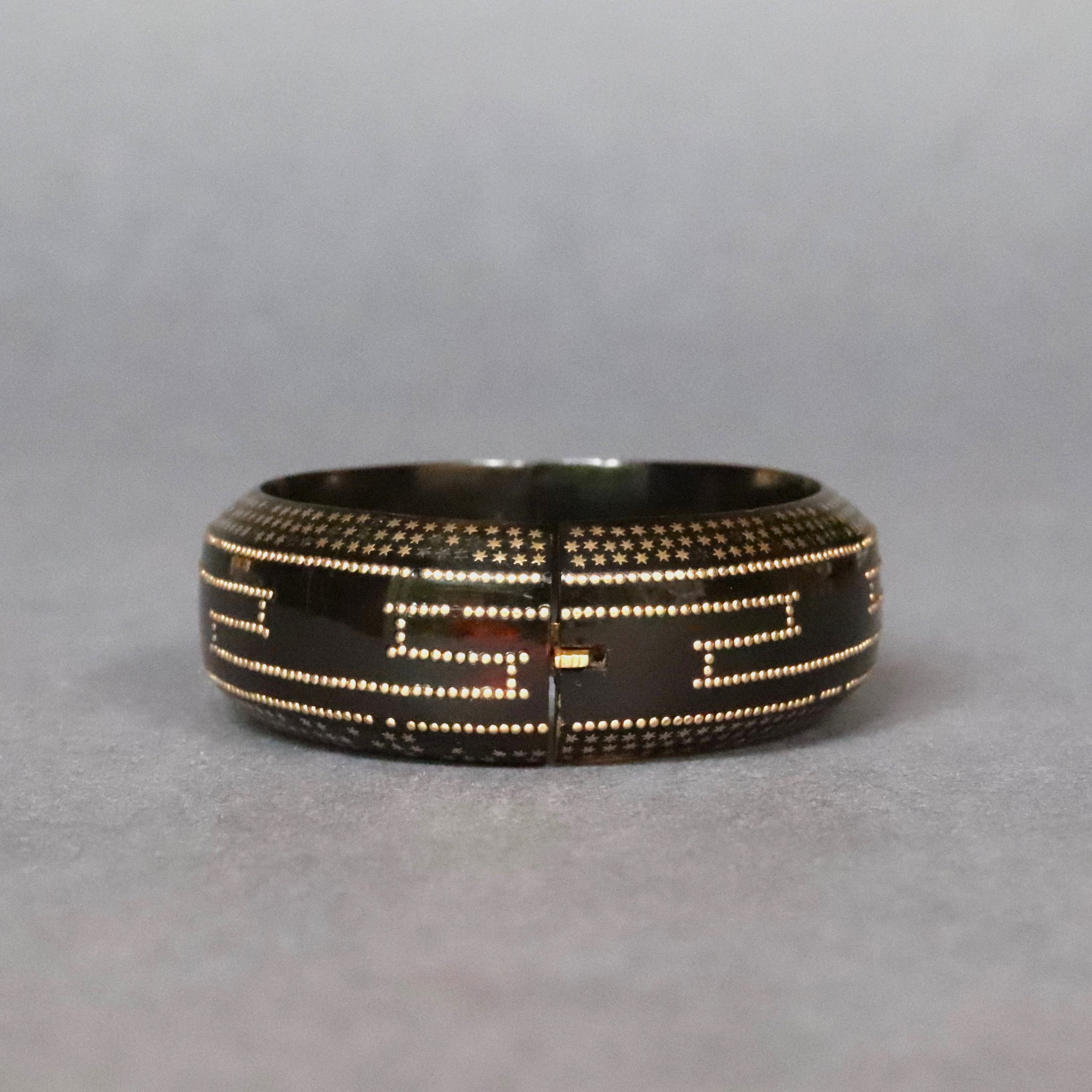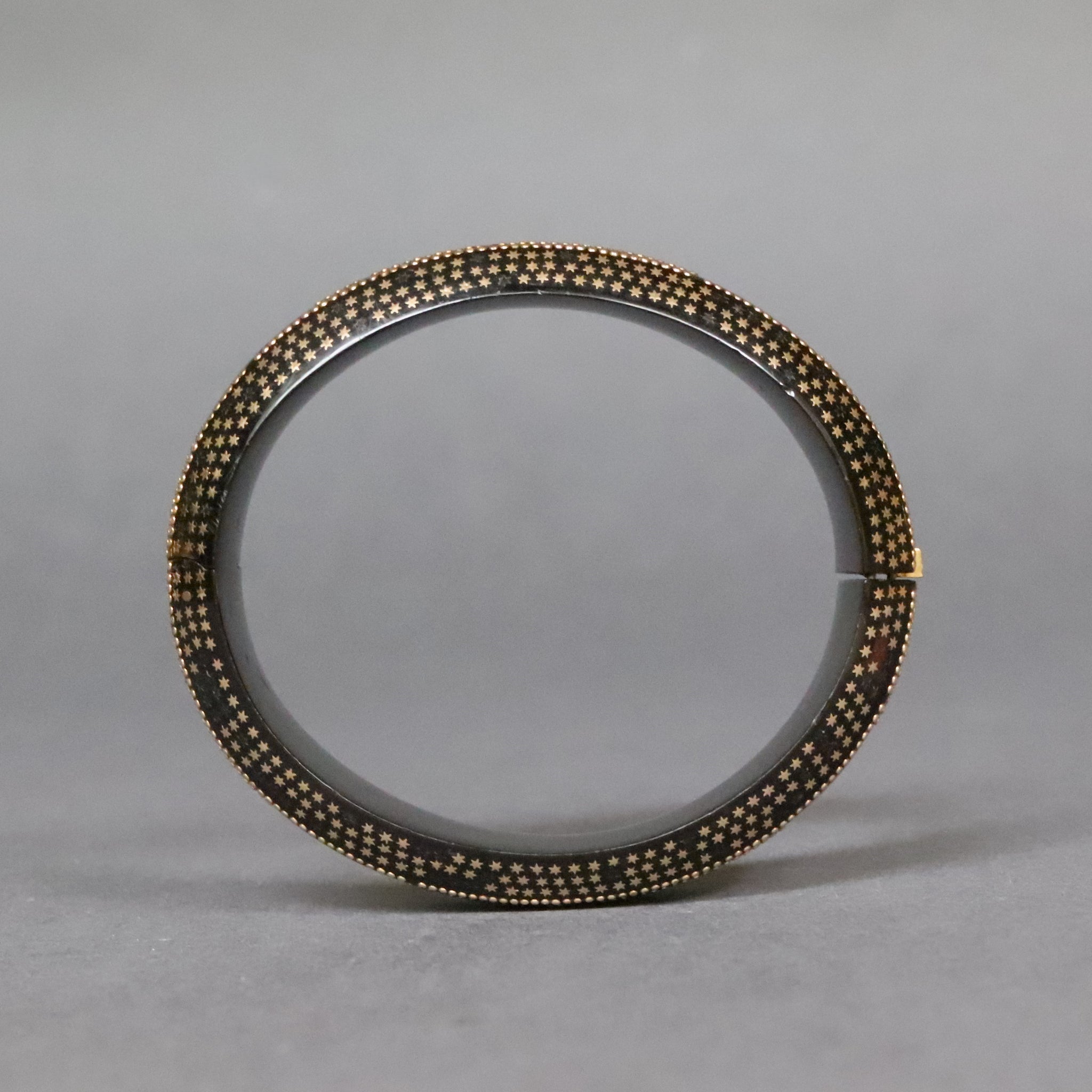 A stunning Victorian era (1837-1901) bangle with incredible details. The bangle is crafted in glossy, dark-hued pique, inlaid with gold appliqué dots in a Greek key design to the circumference (symbolising the eternal flow of life) and hundreds of tiny stars to the outer edges. It closes firmly with a hidden tongue and groove clasp. As impressive as it appears in the images shown here, this piece is even more so in person - a true collectors item.