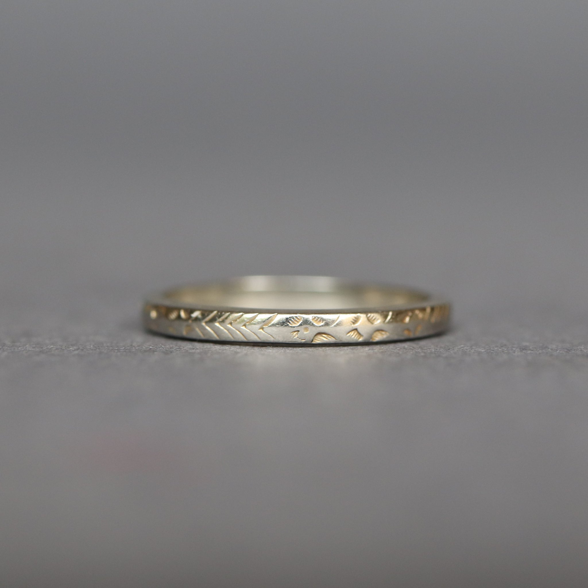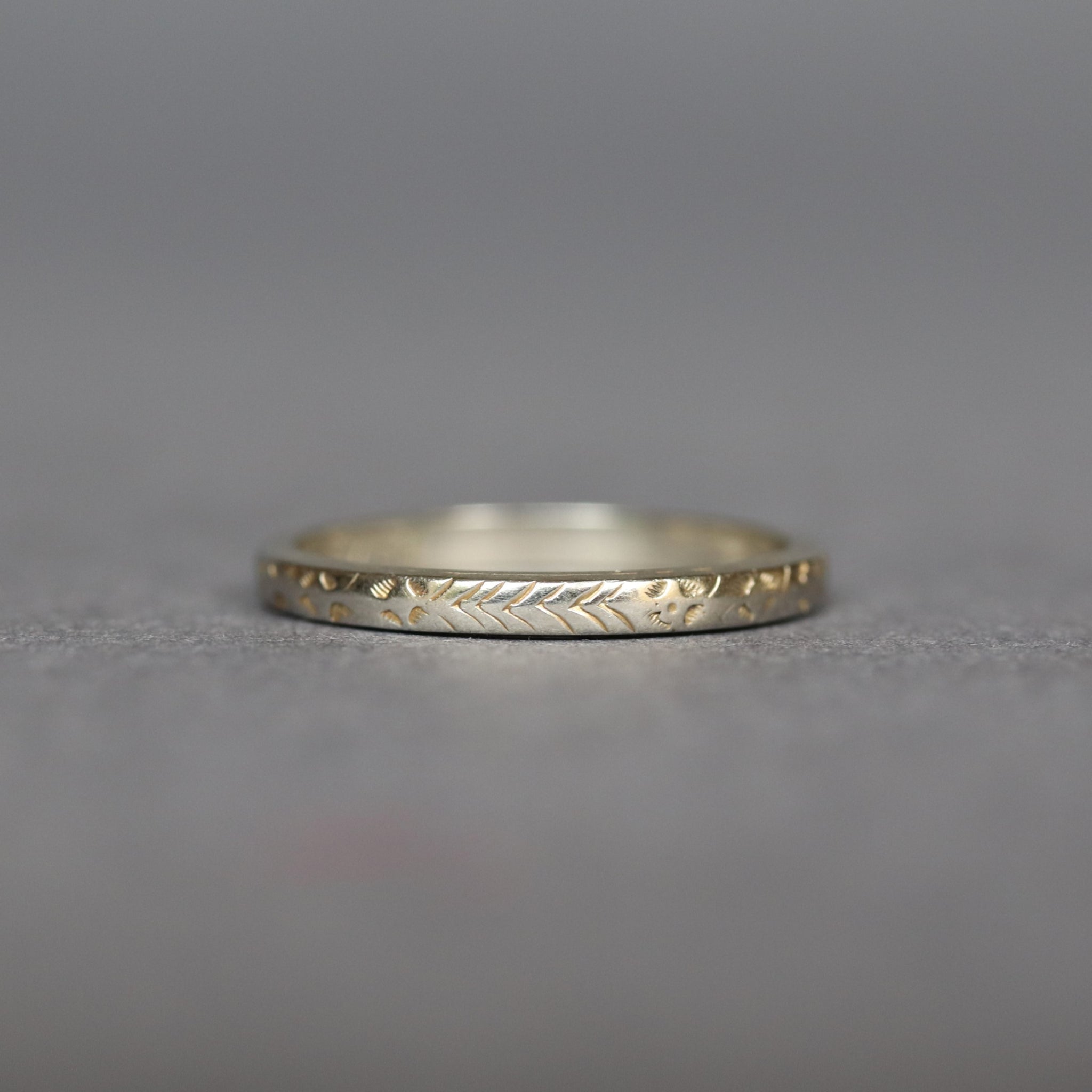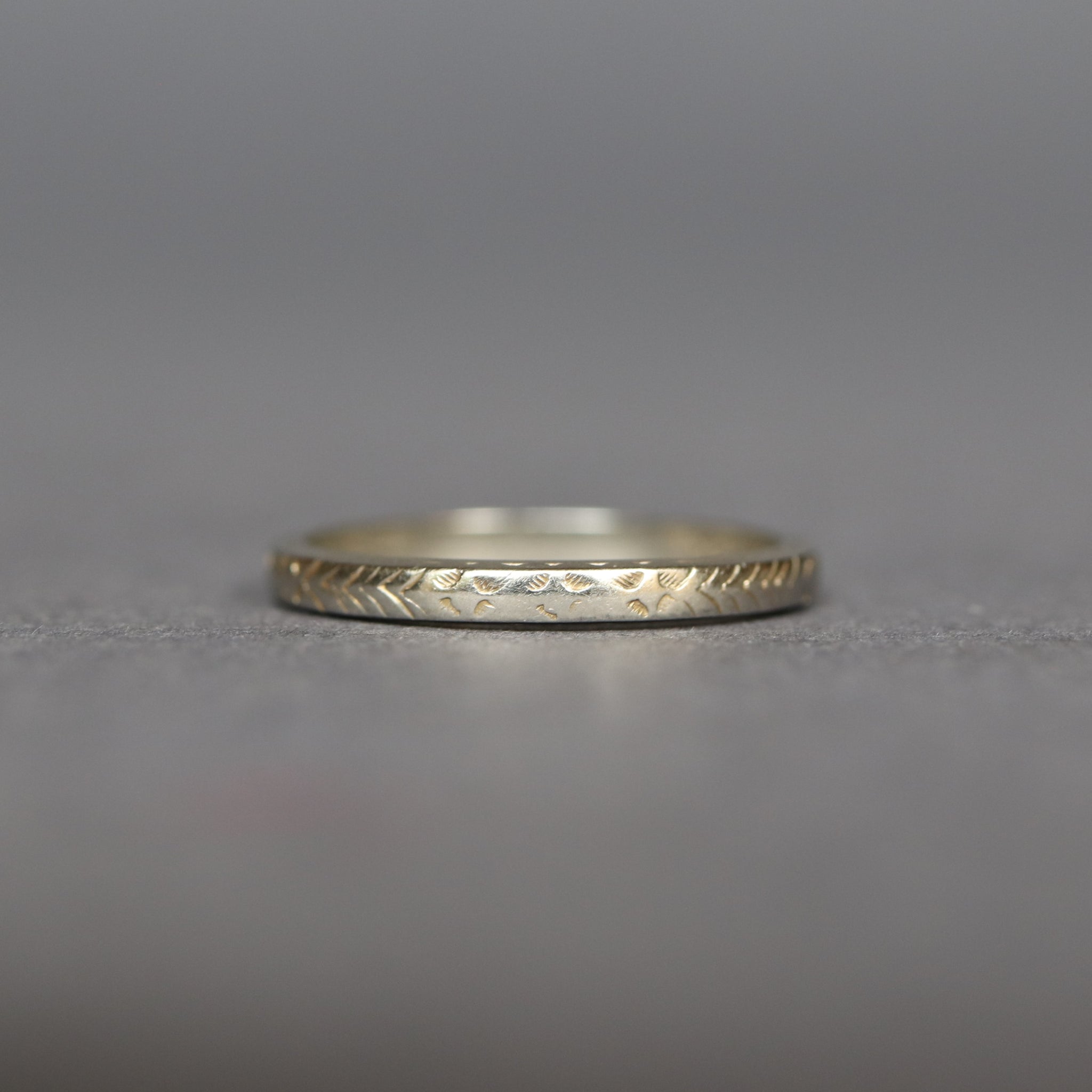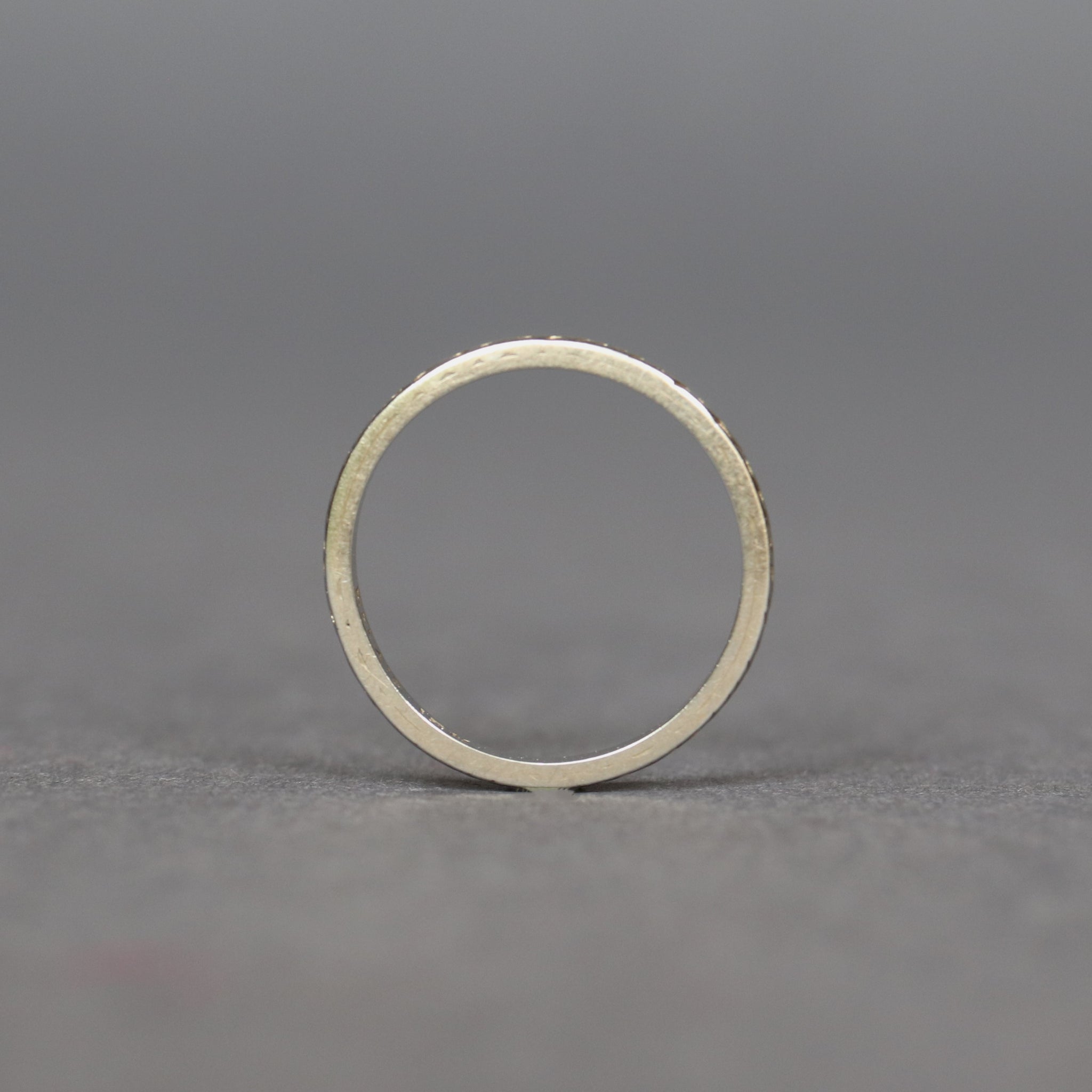 A stunning antique wedding band dating to the Edwardian era (1901-1915). The ring is engraved with an orange blossom motif spanning its entire circumference, symbolic of purity, virtue and innocence. Fashioned in 18ct white gold, the band has a thin profile and sharp edges, making it perfect for stacking or for wear as a wedding ring as it was originally intended.