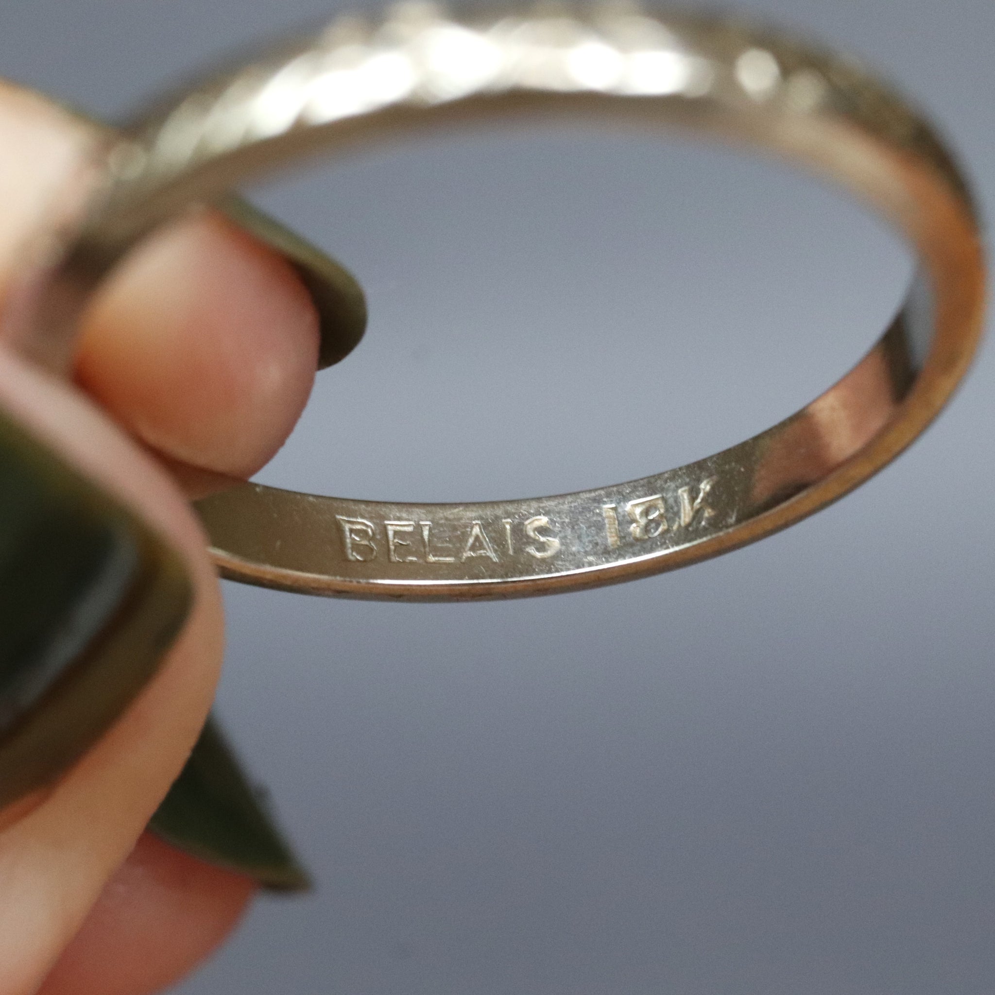 The ring has an interesting provenance. It has a maker’s mark for ‘Belais’, one of the early manufacturers of white gold jewelry in the United States. Around the turn of the century, jeweller David Belais experimented with various alloys for white gold as a substitute for platinum, which he presented to the trade in 1917. The advertising campaign for Belais white gold was so successful that the term 'Belais' became synonymous with white gold. As testament to their success, many prominent jewelers of the time listed in their advertisements the enticement that they sold ’18k Belais.’