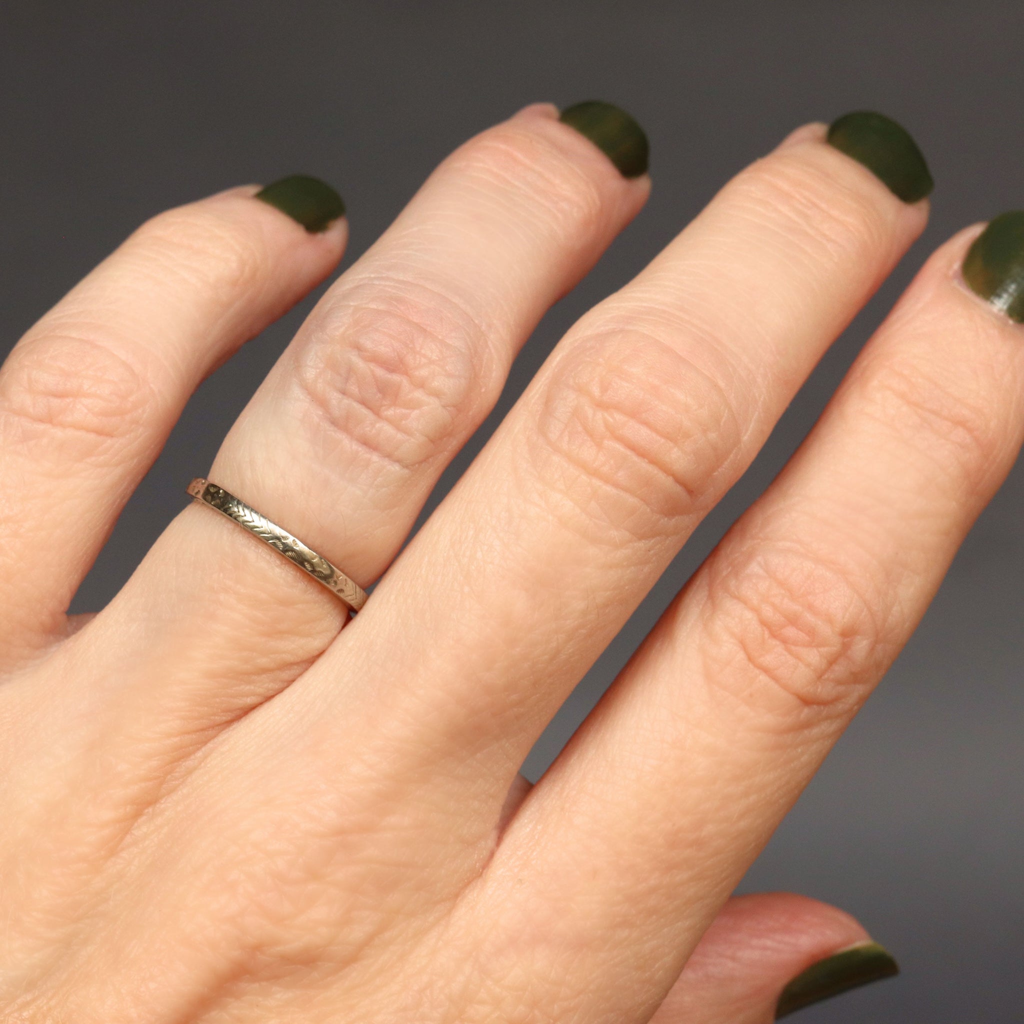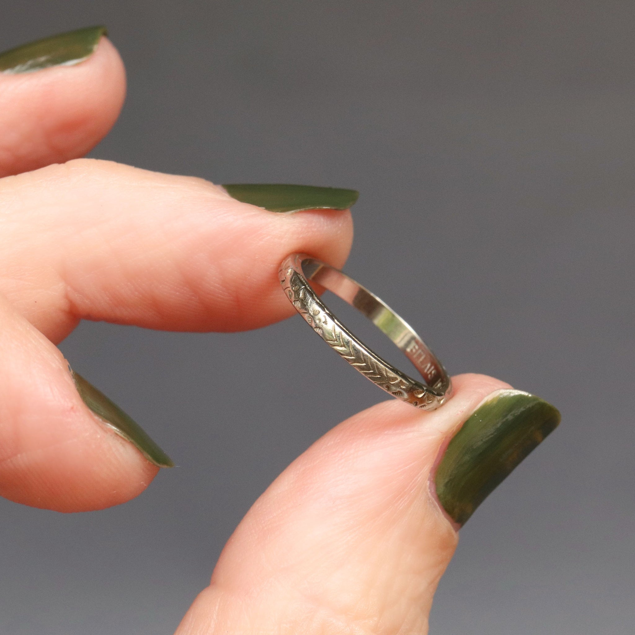 Condition: Good condition with wear commensurate with age. Band is round, stamps and are crisp. The design to the exterior of the band has some rubbing.