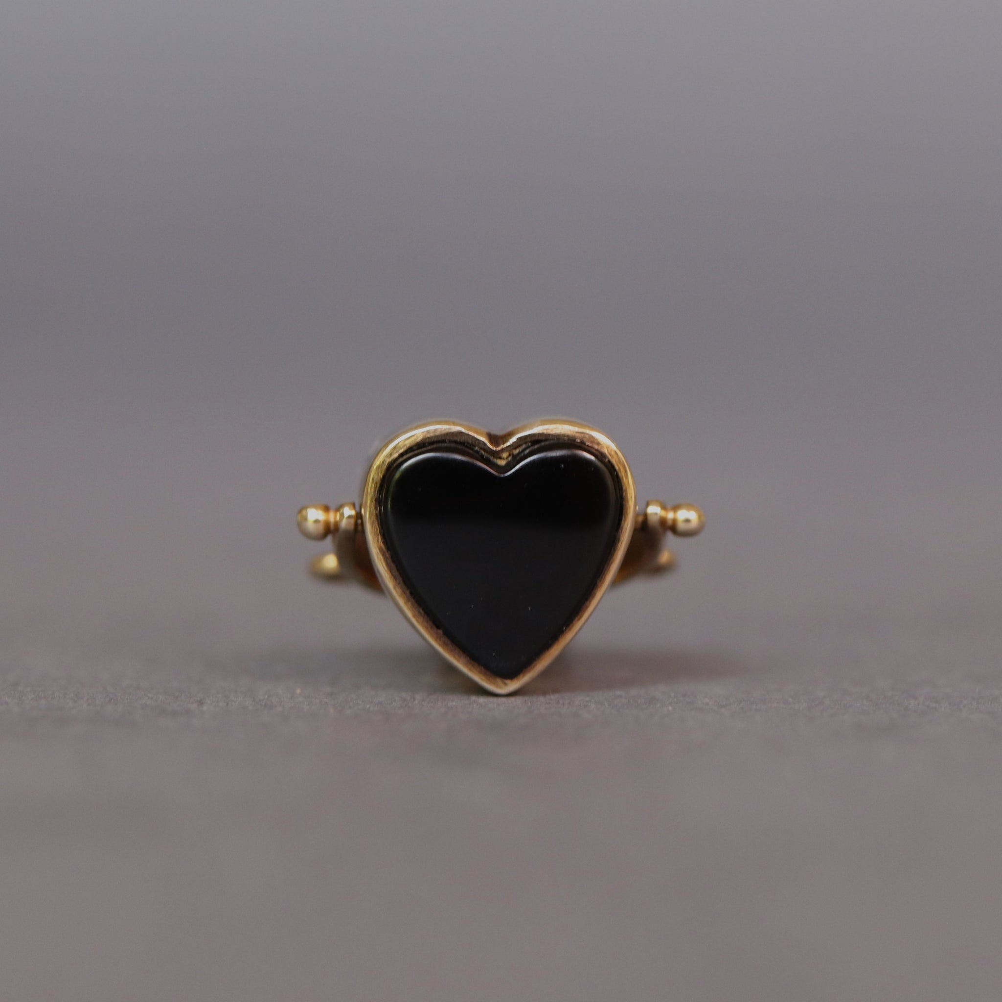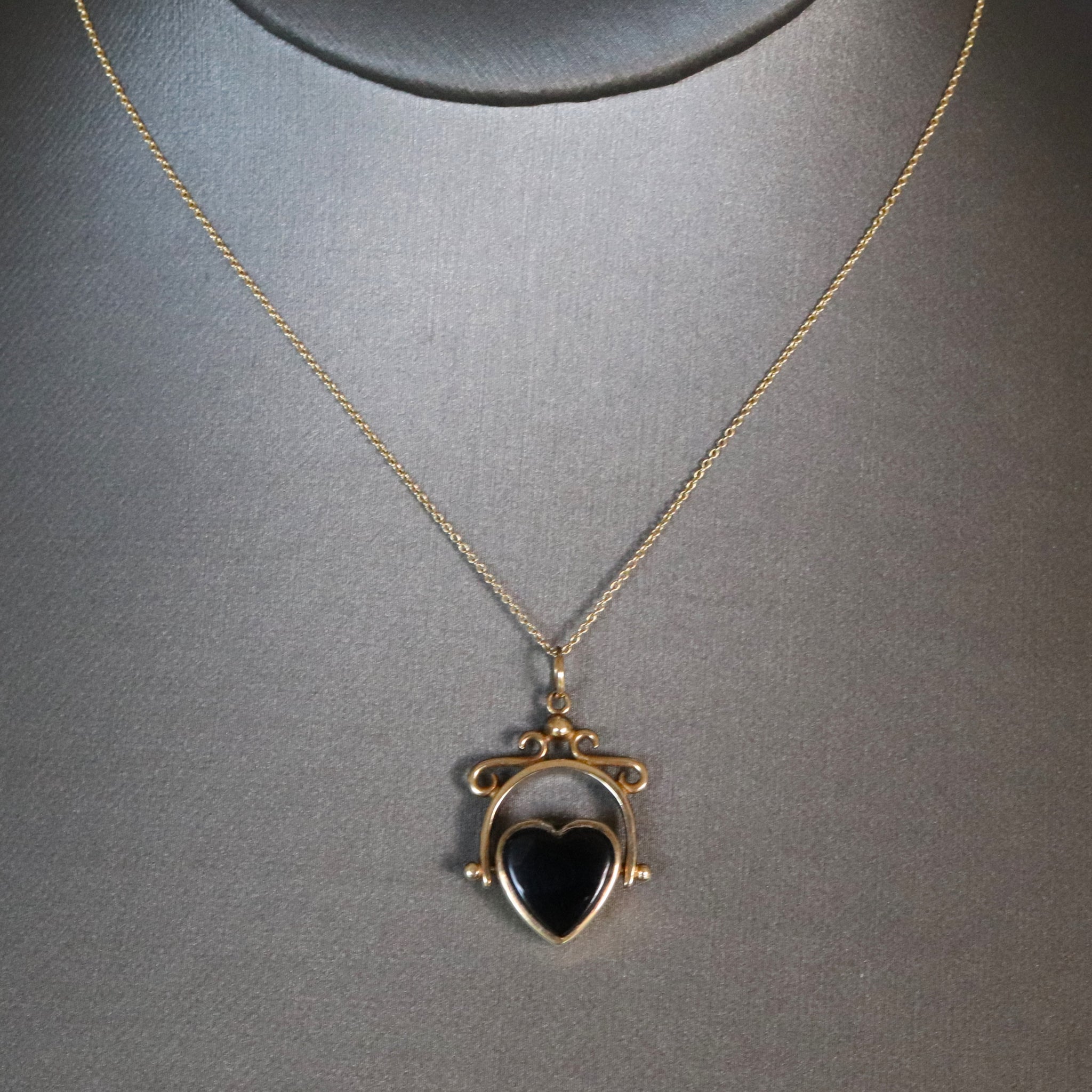 An ever-so sweet vintage spinner fob pendant in 9ct yellow gold. The pendant has a heart-shaped face with a rotating spinner head, set with an onyx to one side and bloodstone to the other. It is held in an arched frame with scrolled decoration and has a bale for wear on a chain.
